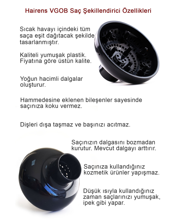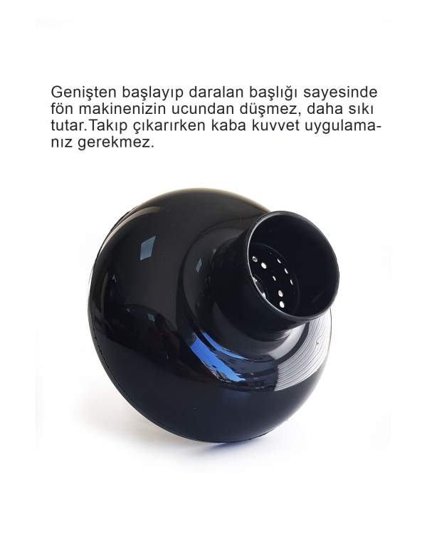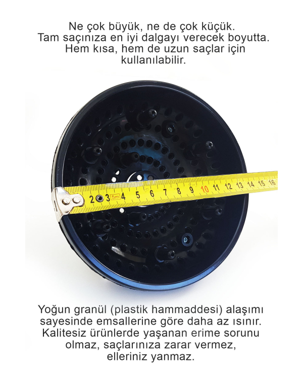 Kıvırcık ve dalgalı saçlar için özel; difüzör başlık, saçın doğal kıvrımını bozmadan kurutma yapar.
